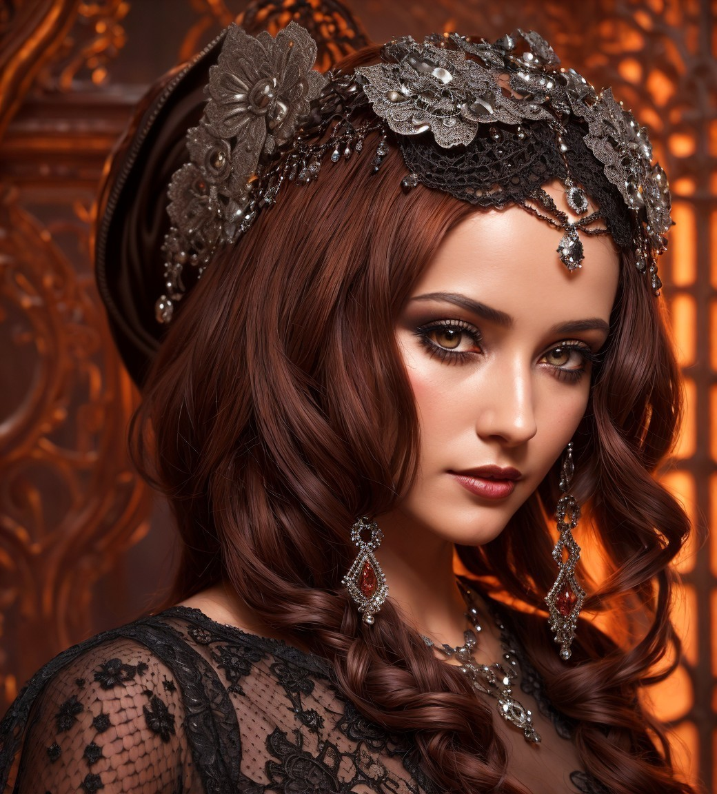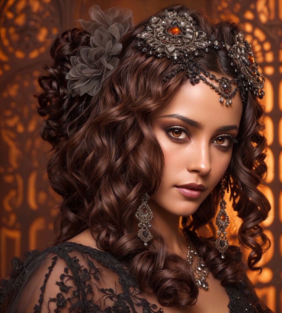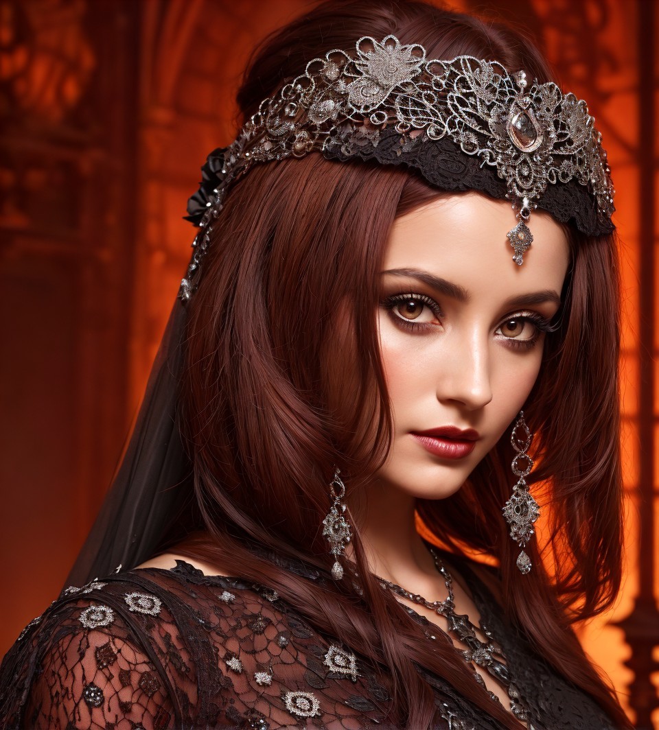 Temptress wearing an ornate black gown, detailed brown curly hairdo with coronet, crochets, beads, pearls contraptions, detailed crackles, set against a mystical backdrop with orange chiaroscuro lighting, 3d effects, ambient occlusion 1.9, grain, hues, mist, brightness 1.9, auracore 1.9, complexion 1.4, reddish-brown aura, radiance, brightness 1.4, silver particles, devilish red eyes, dynamic lighting 1.7, triadic colour scheme black red brown, stylized illustration 1.8, vaporous, octane render, rim lighting, occult, Anglocore 1.9, auracore 1.7, high coloring 1.9, bokeh effects 1.8, intricate ornamental details 1.9, tints of horrorpunk, glossy highlighted reflections, fine strokes, spiritual essence, tints of movie poster art, somber, vivid, fine strokes, coherent, synthetic, forestcore 1.8, tints of Micheal cheval and Margaret Keane, beautiful eldritch fantasy illustration, ambient occlusion 1.5, brightness 1.9, raytraced shadows 1.8, sublime, cottagegore 1.9, dethereal, intricate ornamental details,