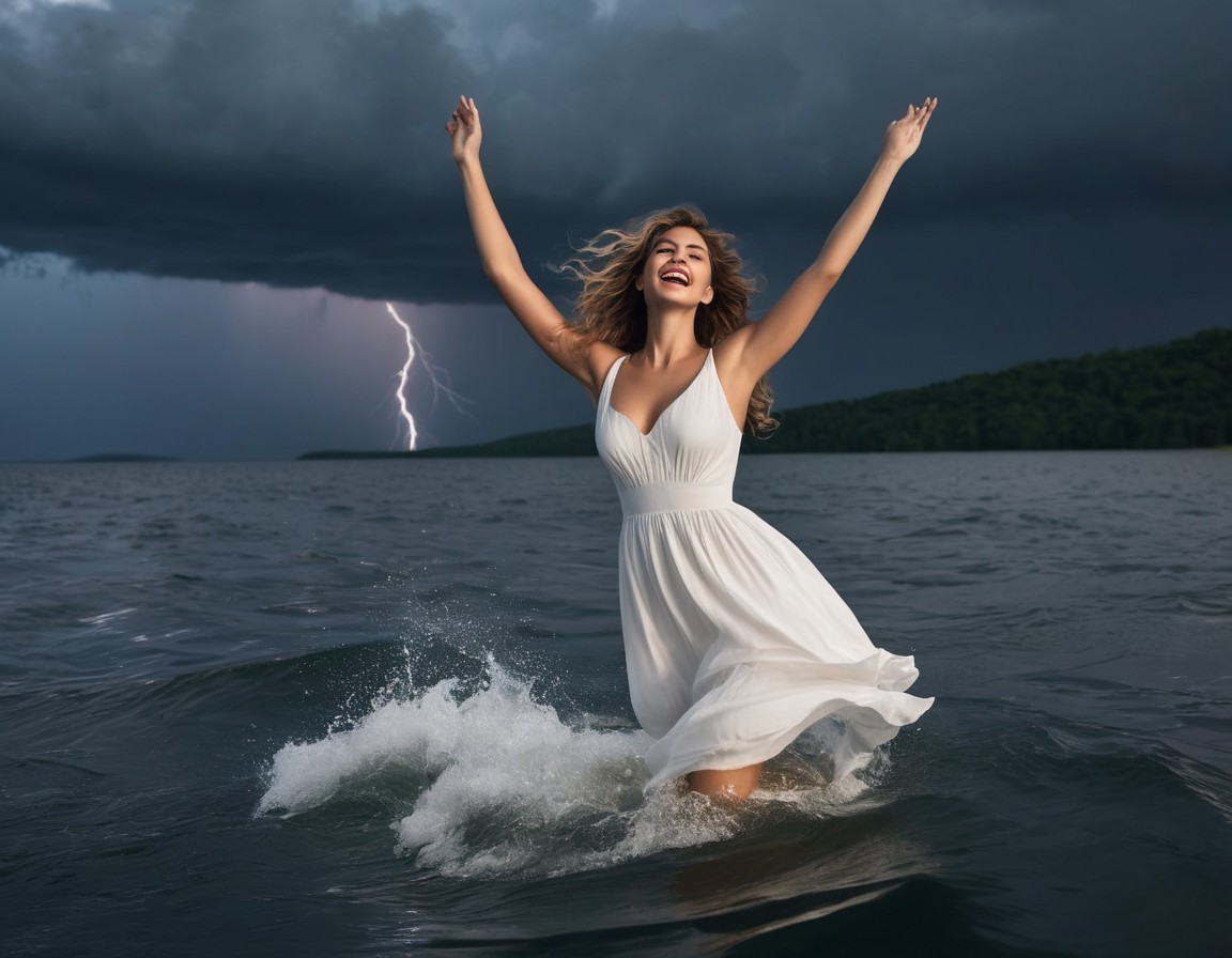 Prompt: "[half body submerged in water at a deep lake] [beautiful caucasian woman's full body] , [white short cotton deeply-cut dress] ,[serene smile parted lips with teeths], [disheveled and flowing hair] [waving both arms above his head] [stormy dark sky] [big waves][lightning] [yacht in background, flying flock of seagulls], [natural look of the face], [natural body figure[, [canvas oil painting],"