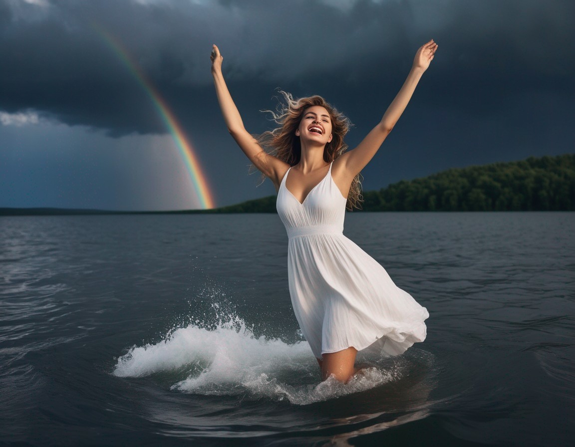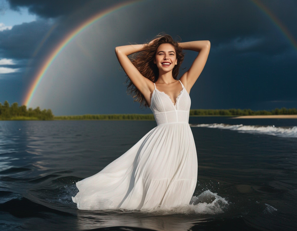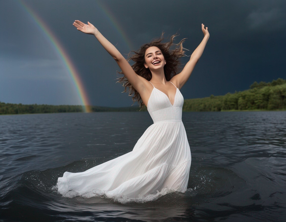 Prompt: [half body submerged in water at a deep lake] [beautiful caucasian woman's full body] , [white short cotton deeply-cut dress] ,[serene smile parted lips with teeths], [disheveled and flowing hair] [waving both arms above his head] [stormy dark sky] [rainbow] [big waves onm the lake][lightning] [yacht in background[ [flying of seagulls], [natural look of the face], [natural body figure[, [canvas oil painting],