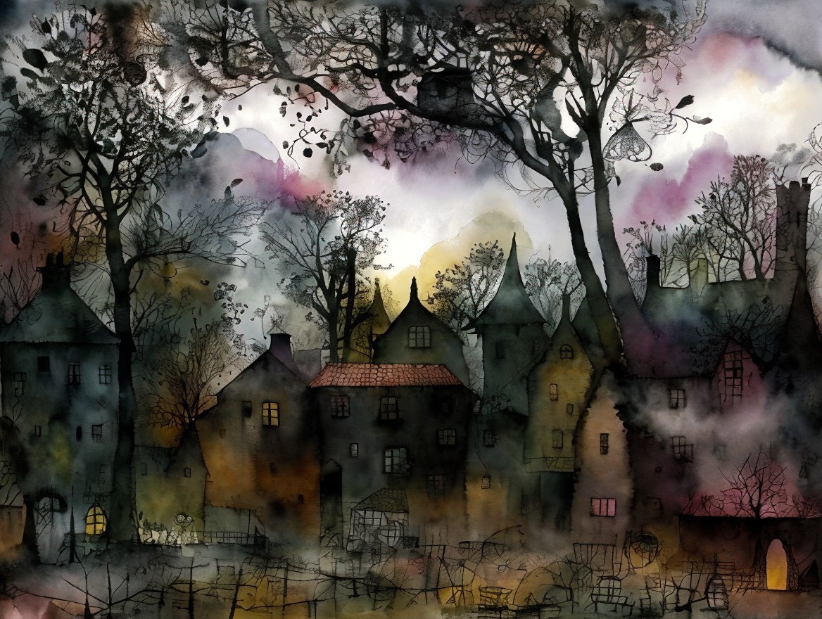 A whimsical, watercolor portrayal of a twilight village, featuring quaint, dark-toned houses, tall, mysterious trees, and shadowy figures wandering the cobblestone streets under a moody sky.