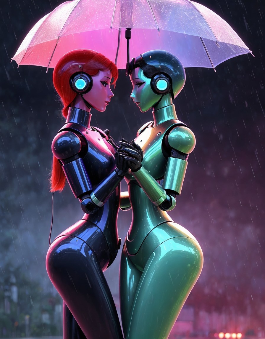 Two beautiful female robots in love celebrate by dancing in the rain together.