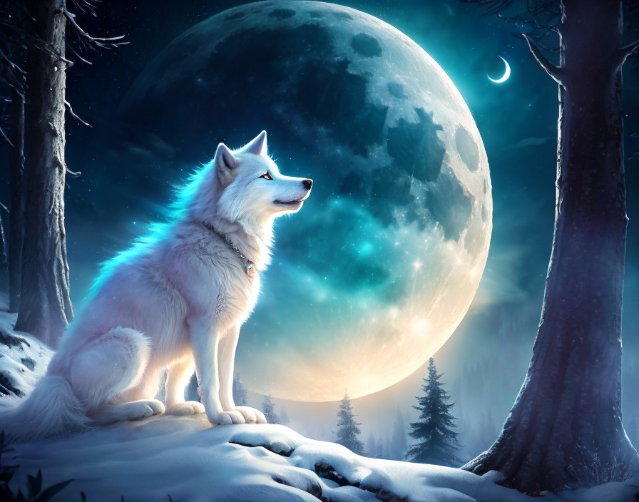 White Wolf on Snowy Hill Under Full Moon and Planet