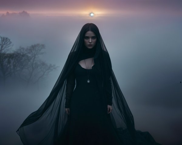 A woman in a black dress with a lace collar and veil stands amidst a misty backdrop, exuding a mysterious and somber aura.