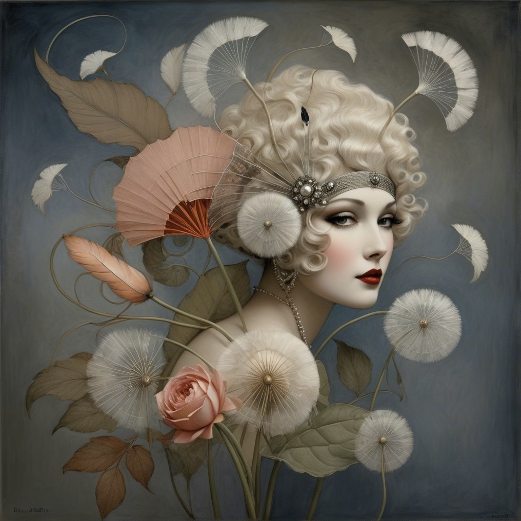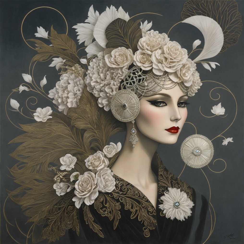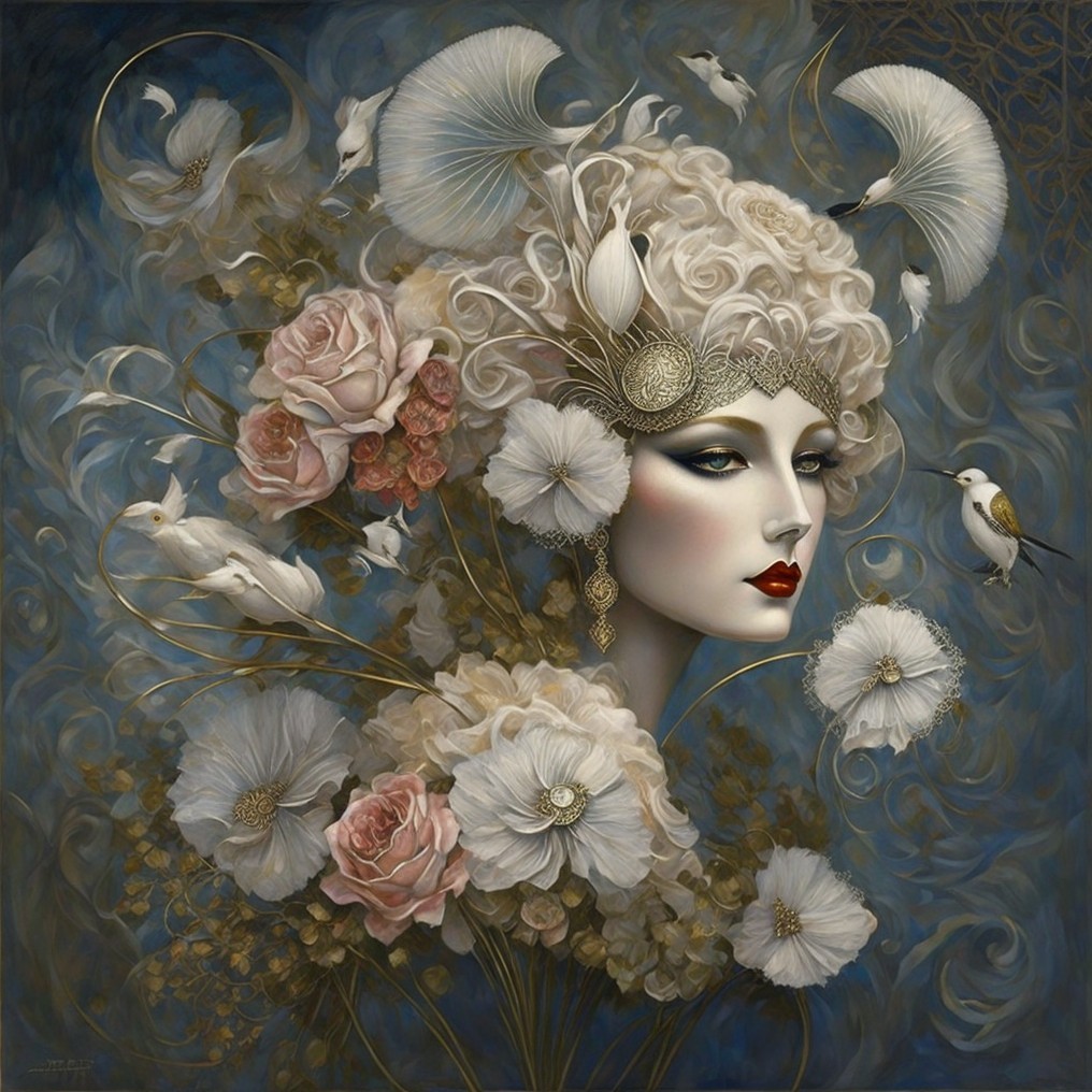 A glamorous woman wears an ornate, gold fan headdress adorned with flowers and pearls. White birds flutter nearby, enhancing the elegance of her rich black and gold attire.