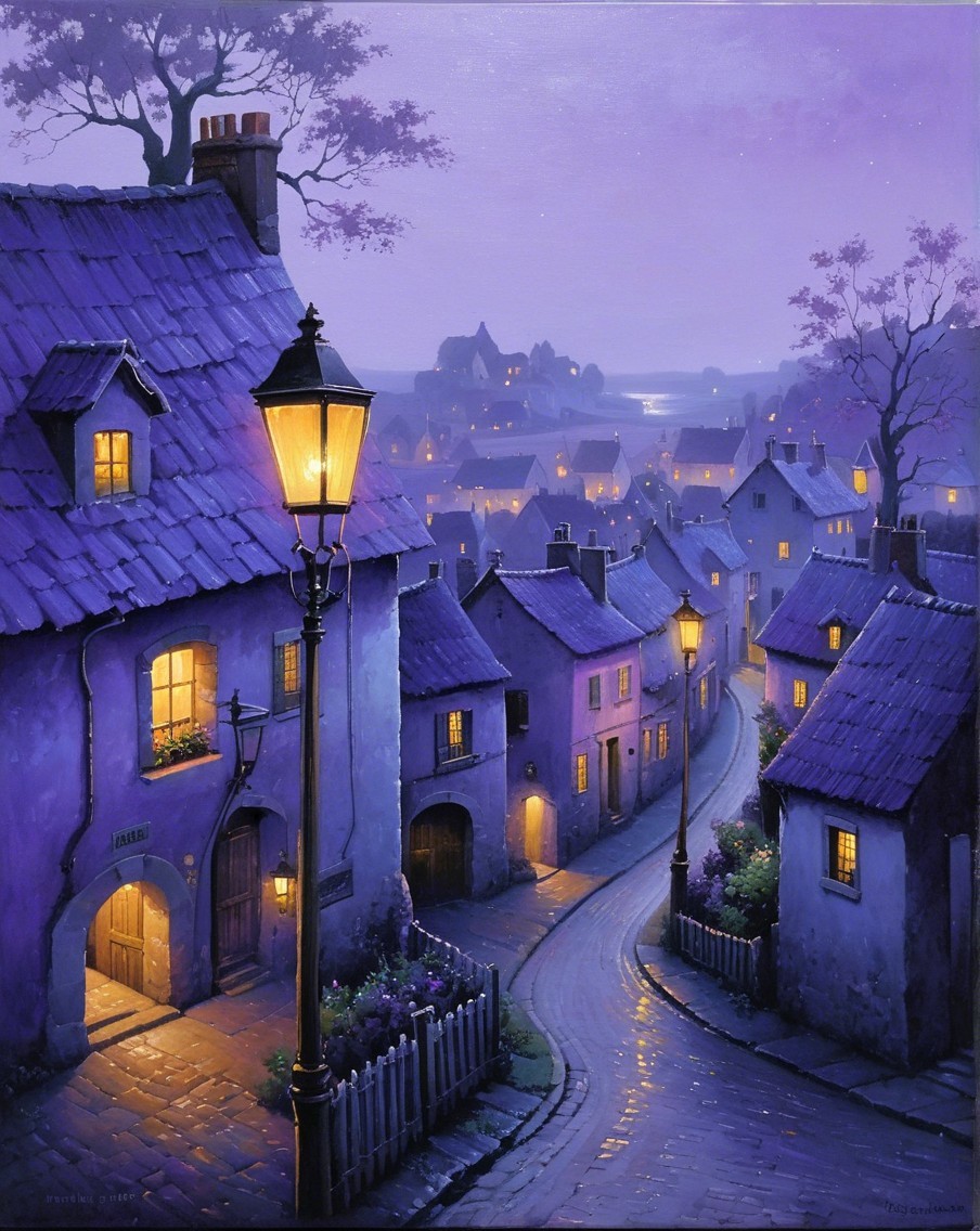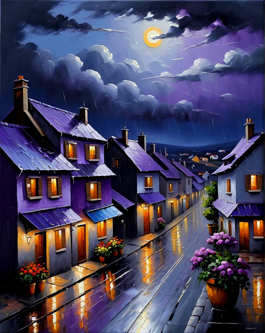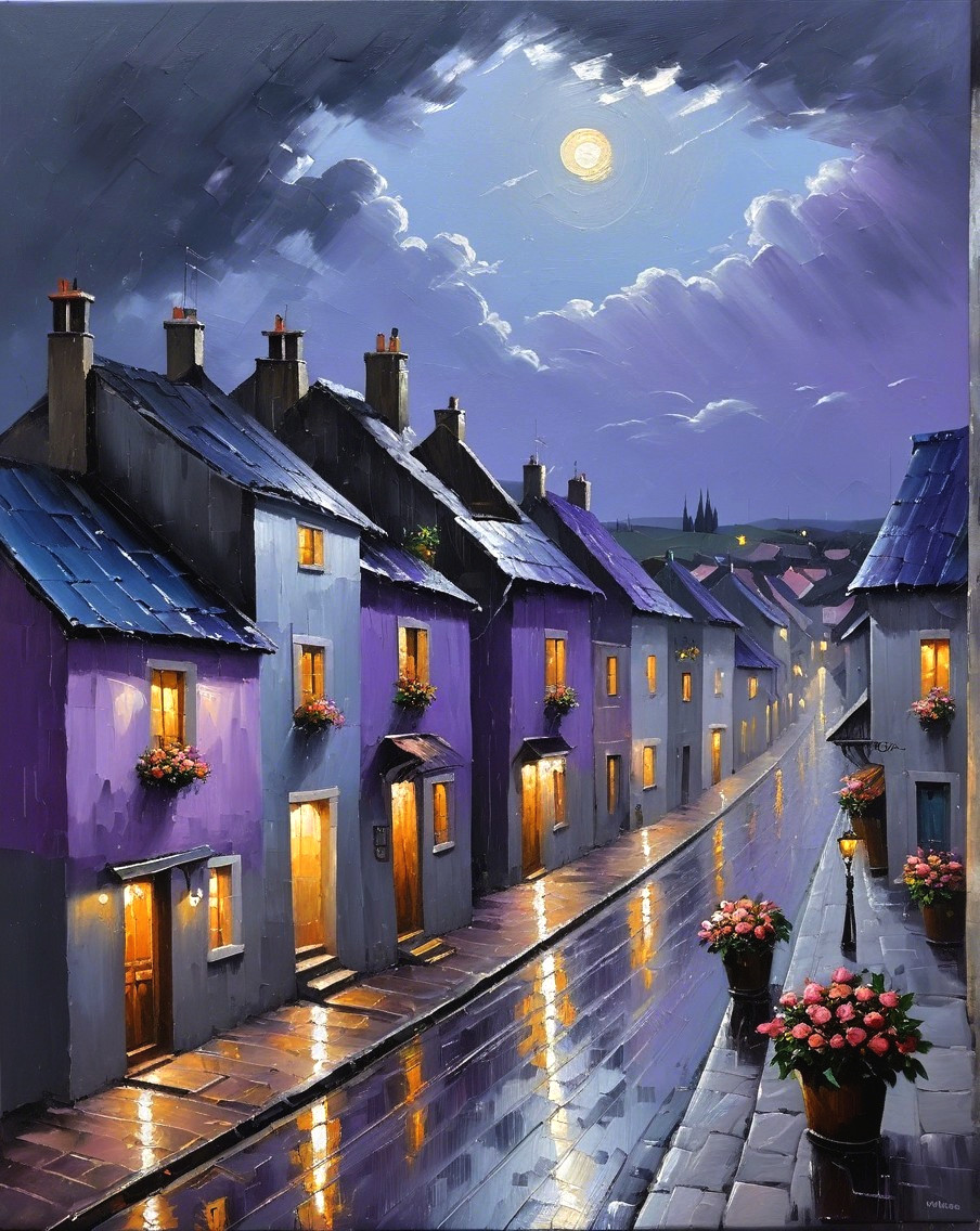A serene evening scene features cozy houses with glowing windows, lined by cobblestone streets reflecting a stormy purple sky. The moonlight glimmers through dramatic clouds, enhancing the atmosphere.