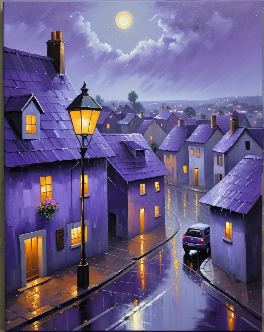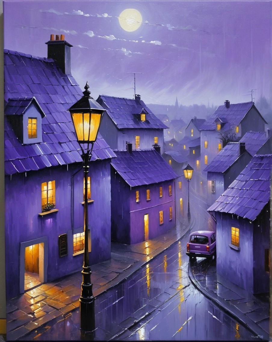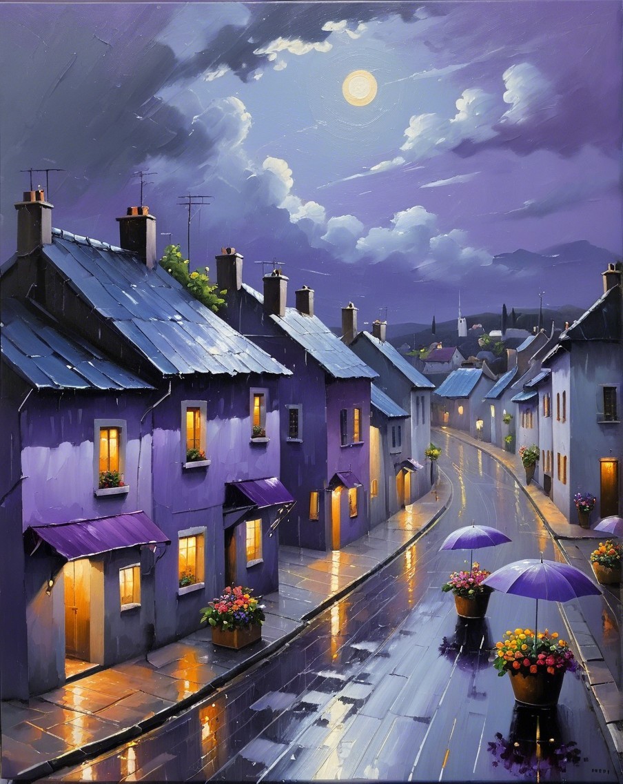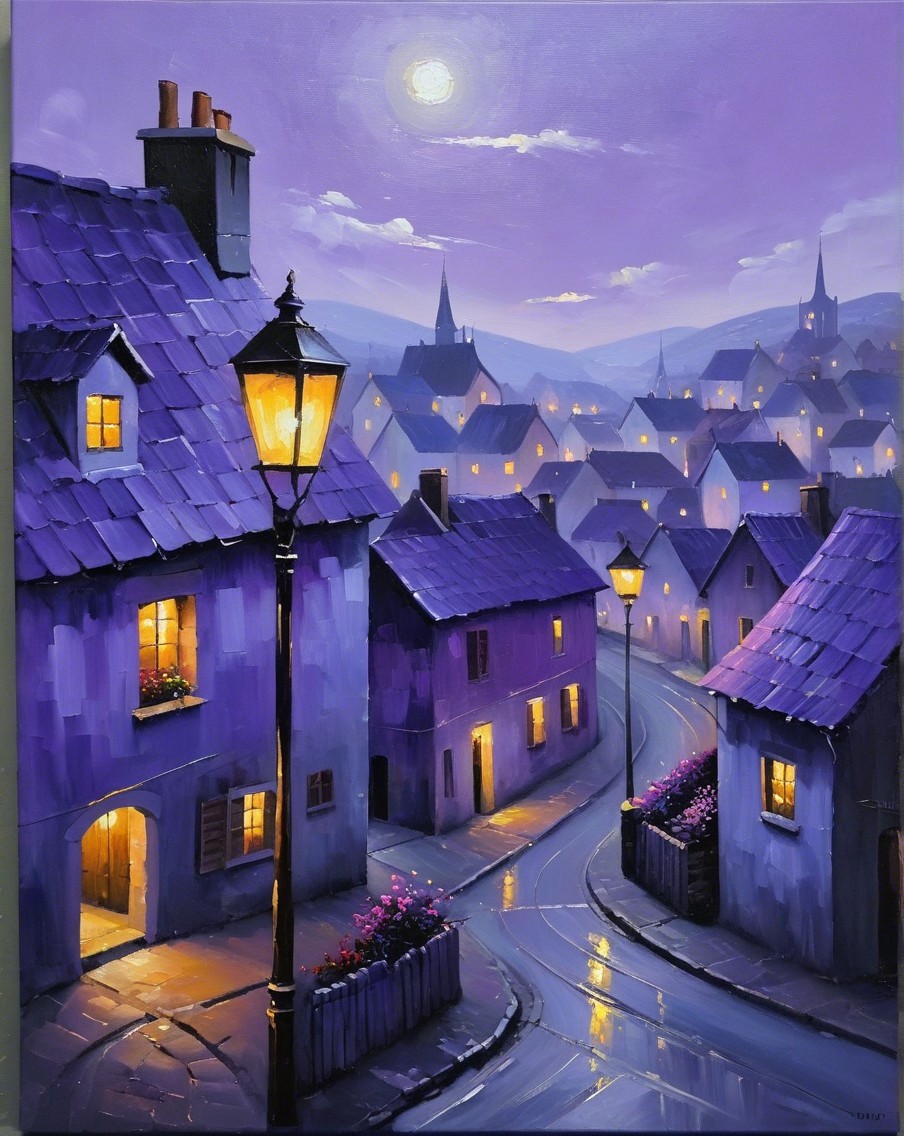 A serene evening scene features cozy houses with glowing windows, lined by cobblestone streets reflecting a stormy purple sky. The moonlight glimmers through dramatic clouds, enhancing the atmosphere.