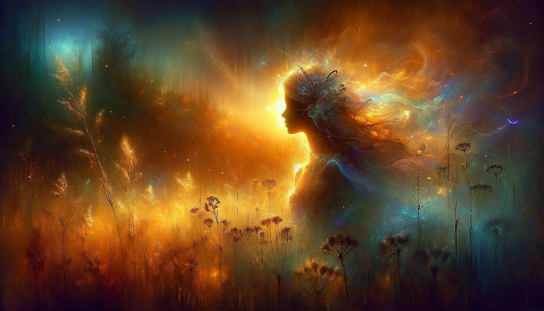 In a dreamy landscape bathed in warm, golden-ochre hues, a silhouette emerges—a woman with flowing hair that blends seamlessly into the mystical environment. Her features remain elusive, obscured by the very essence of the world around her. The air stirs with swirling particles, akin to fireflies caught mid-flight, weaving memories and sensations into the fabric of her being. She is both delicate porcelain and rusted metal, a fusion of textures that tells stories of survival.