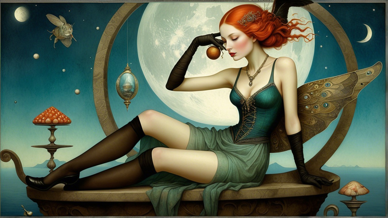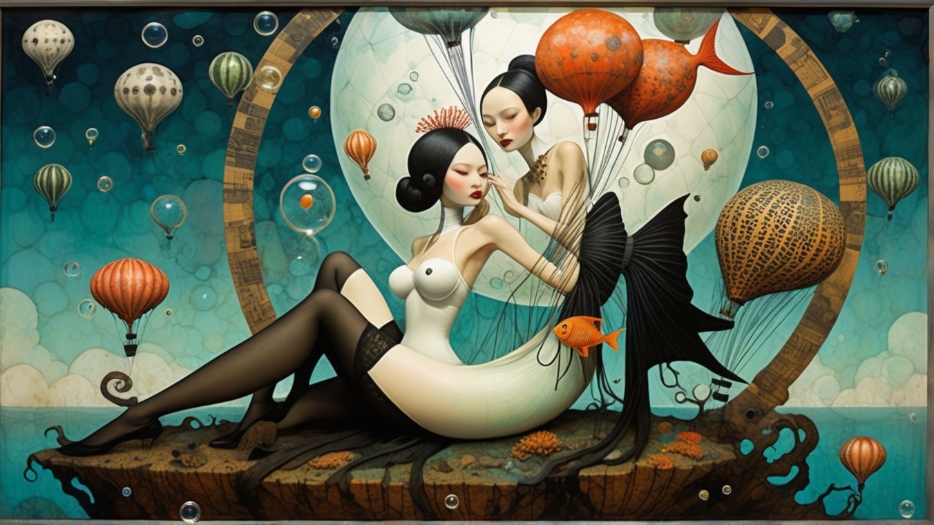 This captivating artwork features a fantastical landscape with whimsical hot air balloons floating above intricate, colorful structures perched on a stylized terrain, set against a vibrant blue sky.