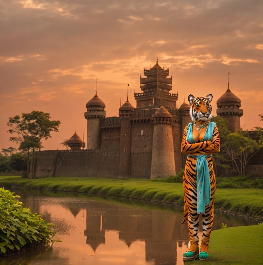 Tiger woman standing outside of Bangladesh castle