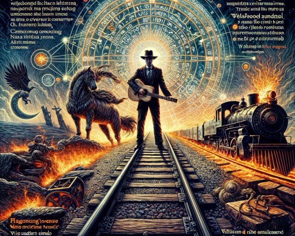 Stylized skeleton with sword and shield on clouds in dramatic lighting