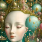 A surreal portrait features a serene, doll-like face surrounded by whimsical elements, including delicate creatures, floral motifs, and dreamy landscapes in vibrant colors.