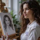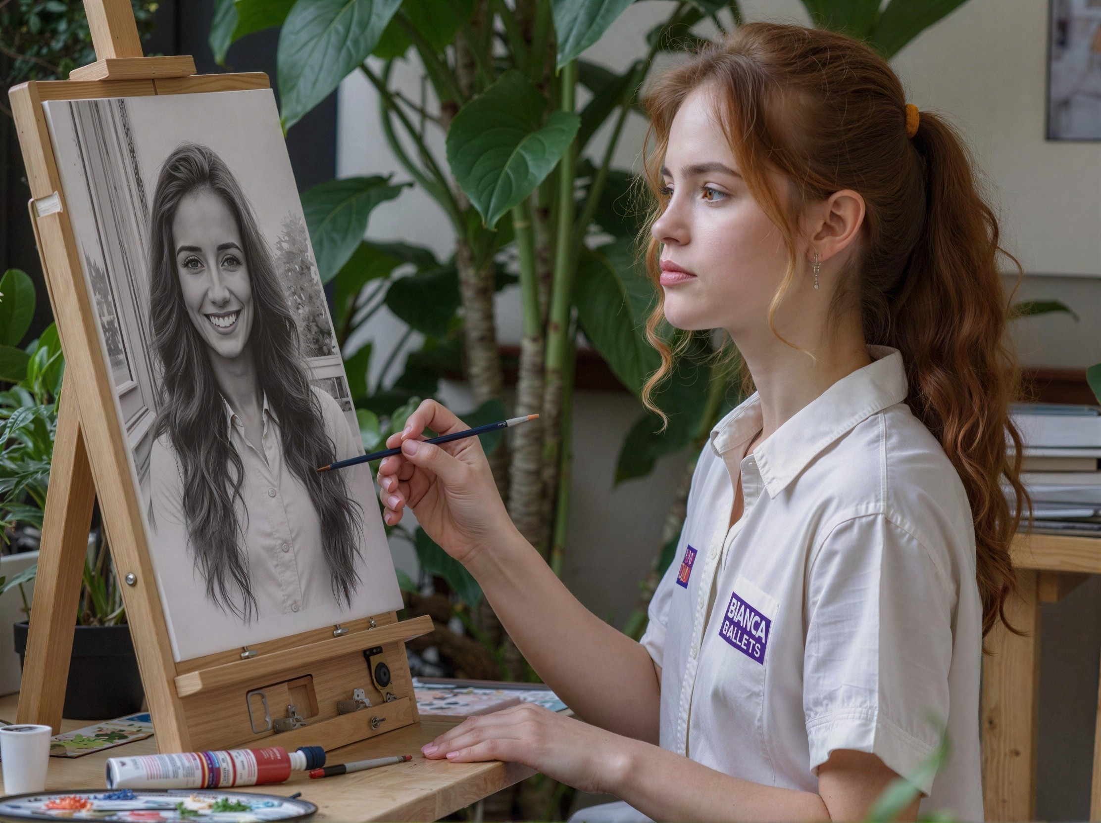 A medium shot portrait of a young white ginger woman painting a hyperrealistic grayscale pencil drawing of a woman with long wavy hair and a collared shirt smiling with teeth and looking at the viewer on a canvas perched on a wooden easel, on a light brown wooden table; the woman drawing is wearing a white