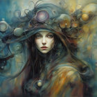 A mystical woman gazes forward, her flowing hair entwined with swirling cosmic elements and planets, blending vibrant colors of blue, orange, and green in an ethereal, dreamlike atmosphere.