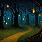 A mystical twilight forest features twisted trees and a winding stone path. Glowing lanterns illuminate the scene, casting an enchanting light amidst a soft blue mist.