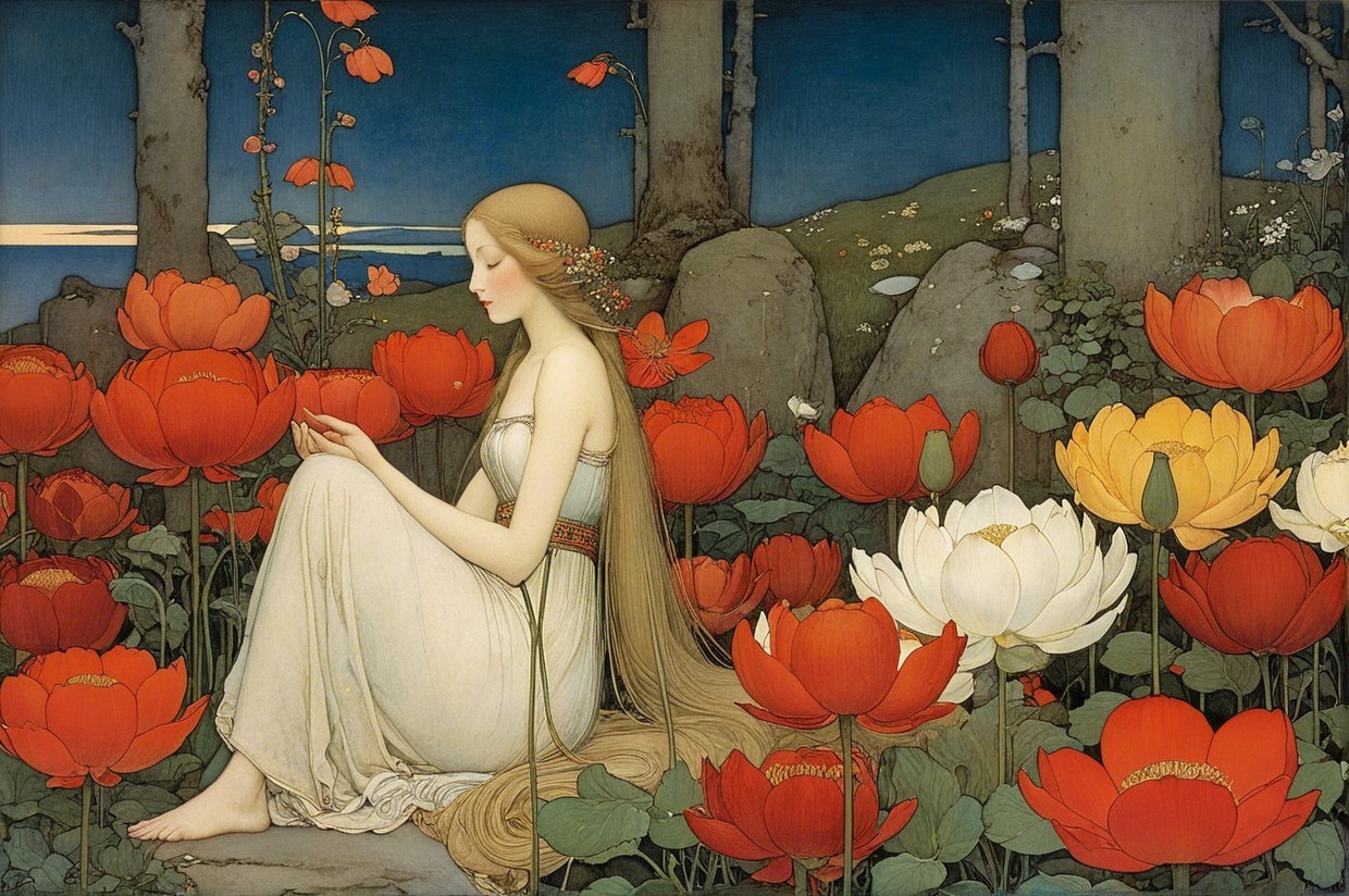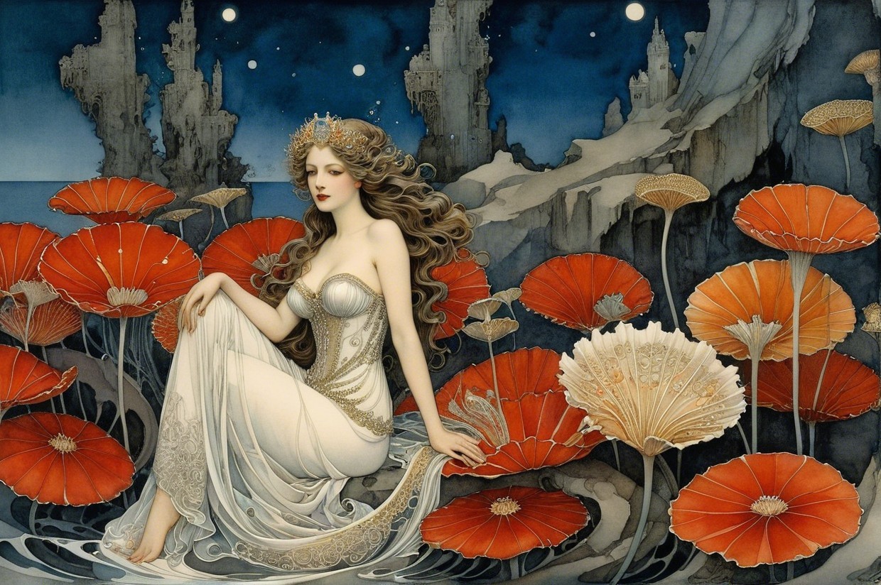 A serene underwater scene features a woman with flowing hair and a shimmering outfit, surrounded by vibrant orange fish. The backdrop is a deep blue, enhancing the mystical atmosphere.