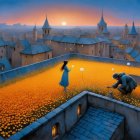 A whimsical scene shows a fairy reading on a rooftop, surrounded by vibrant yellow flowers. Below, a figure examines nature, with charming rooftops and a sunset in the background.