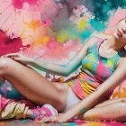 A serene beach scene at dusk features two figures strolling along the shoreline, surrounded by vibrant pink cherry blossoms and glowing lotus flowers, under two luminous moons.