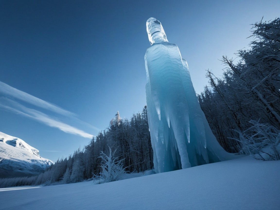 The image features a towering ice sculpture resembling a powerful figure, surrounded by snowy landscapes and evergreen trees under a clear blue sky, with trails from aircraft in the background.