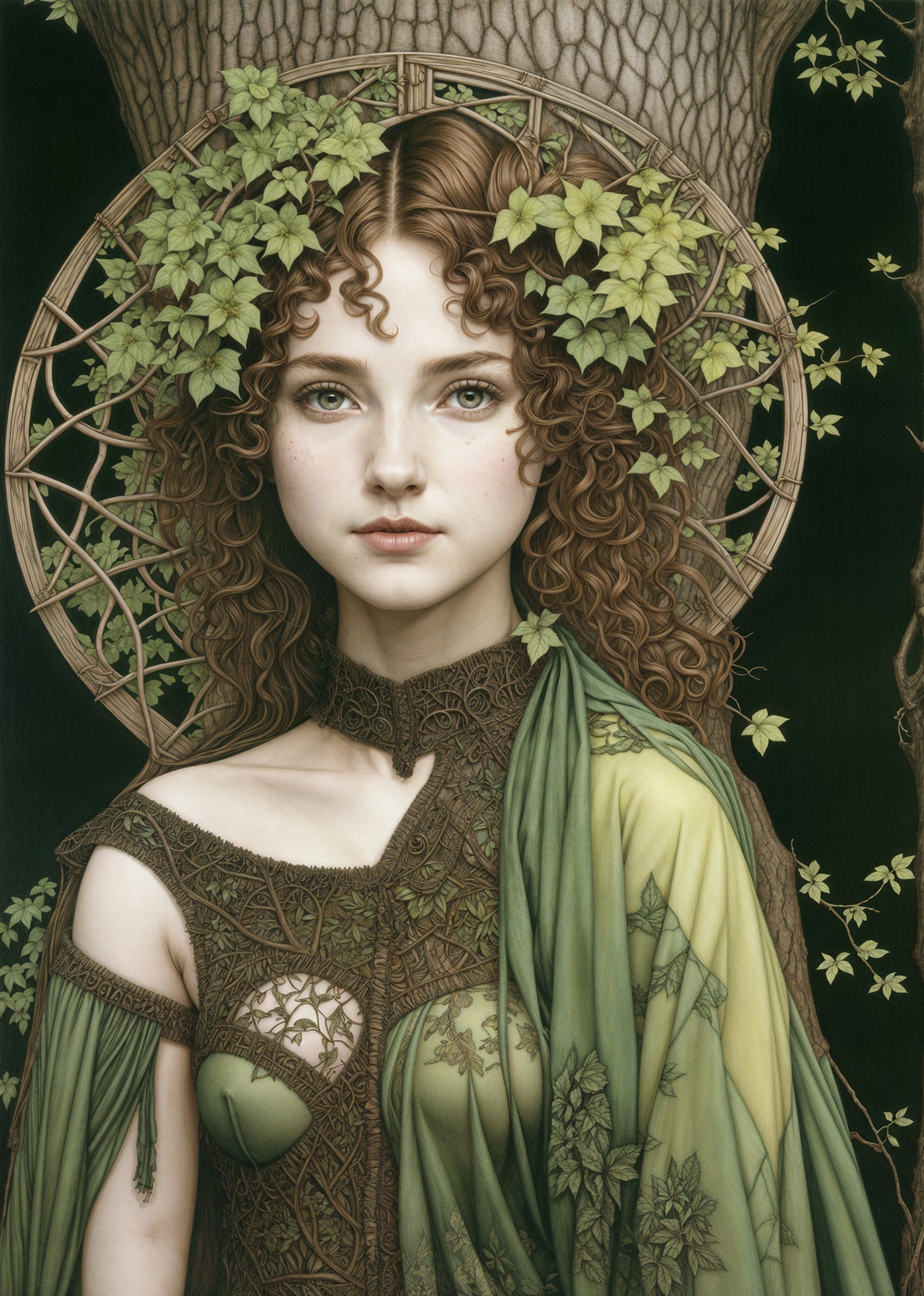 The image features a young woman with voluminous curly hair, softly illuminated, wearing a draped garment. She holds a circular object, surrounded by a natural, mystical setting.