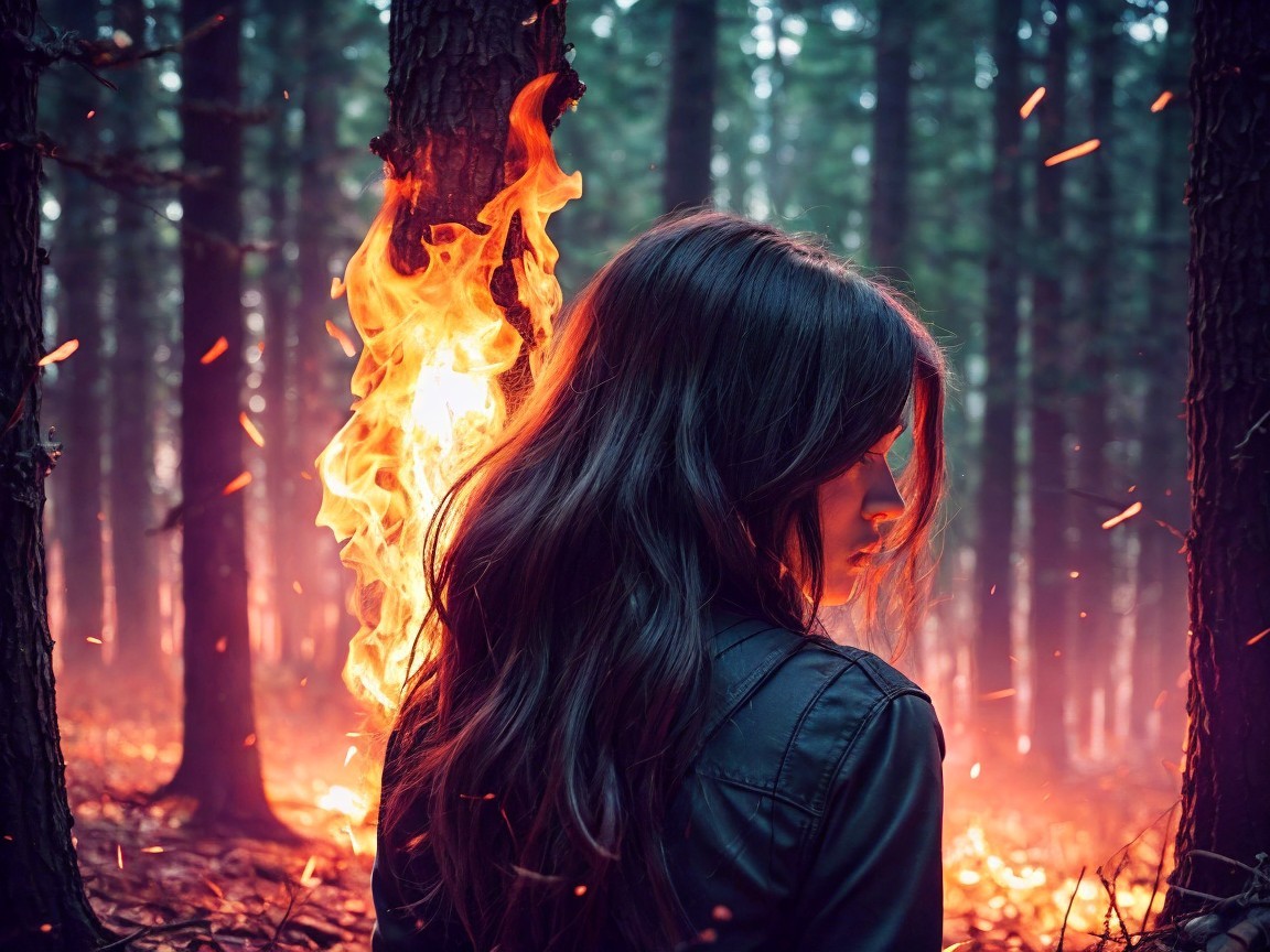 A girl with long hair stands in a forest, her back to the viewer. Flames engulf a nearby tree, casting an eerie glow through the misty woods, creating a striking contrast between fire and nature.