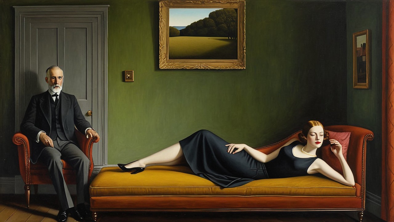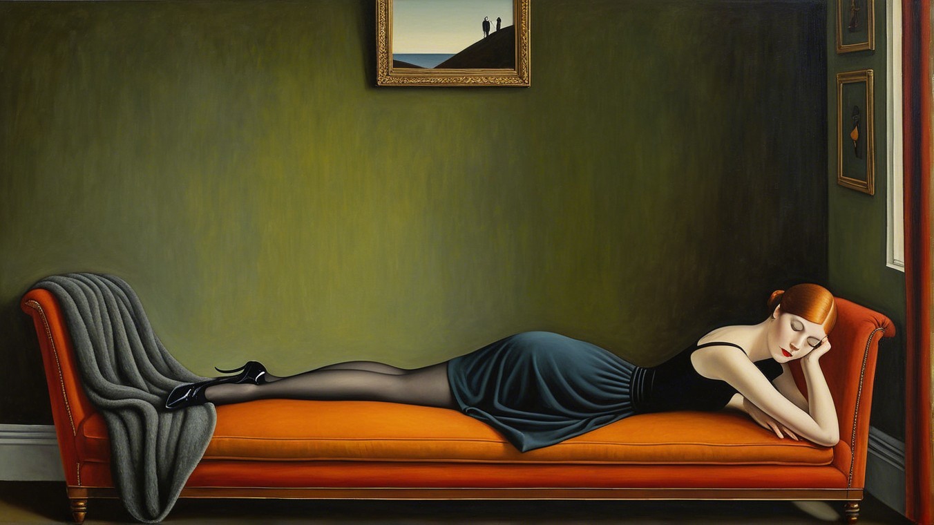 A woman in a green dress lies on an orange chaise, her head resting on her arm. The room features a simple nightstand and a landscape painting, creating a serene and contemplative atmosphere.