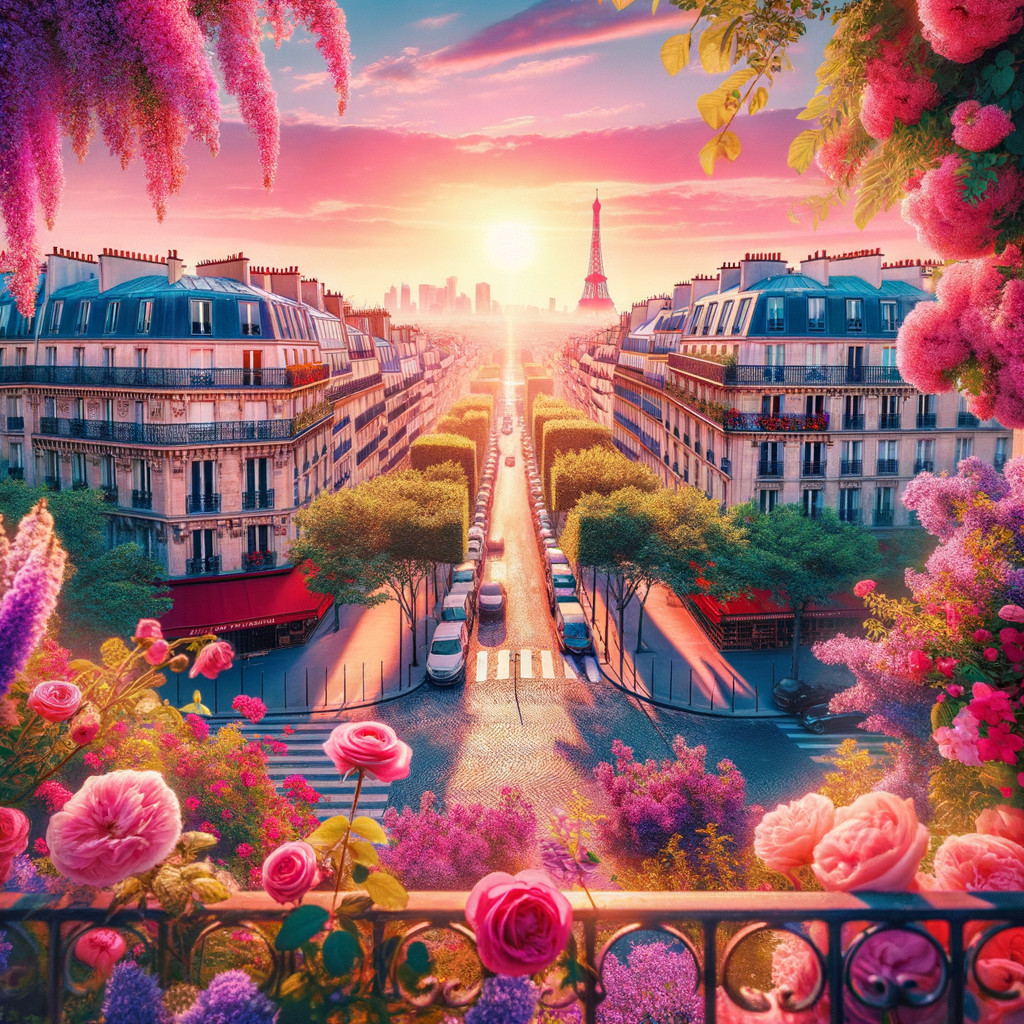Sunset over Paris with the Eiffel Tower, blooming flowers, a river, and classical buildings.