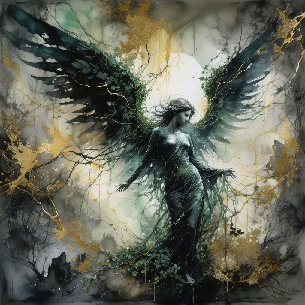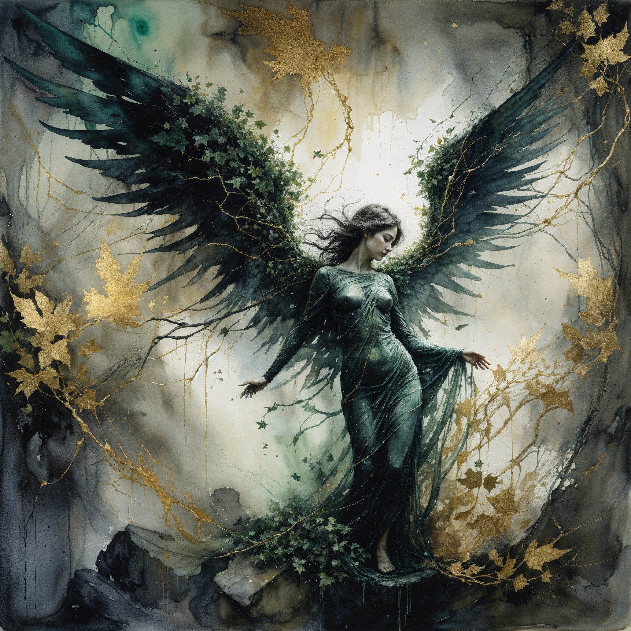 An ethereal figure with dark wings stands amidst swirling colors and gold accents. Dressed in a flowing green gown, she embodies grace and mystery, surrounded by ivy and soft textures.