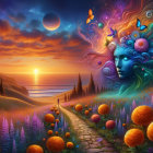 A surreal landscape features vibrant, swirling clouds in hues of purple, orange, and blue. A figure walks along a winding path, while a serene feminine face emerges from the mountain backdrop.