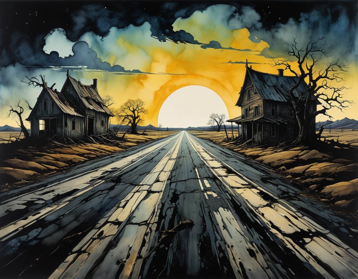 Prompt: "Empty rural roads. Deserted, abandoned apocalypse wreckage.