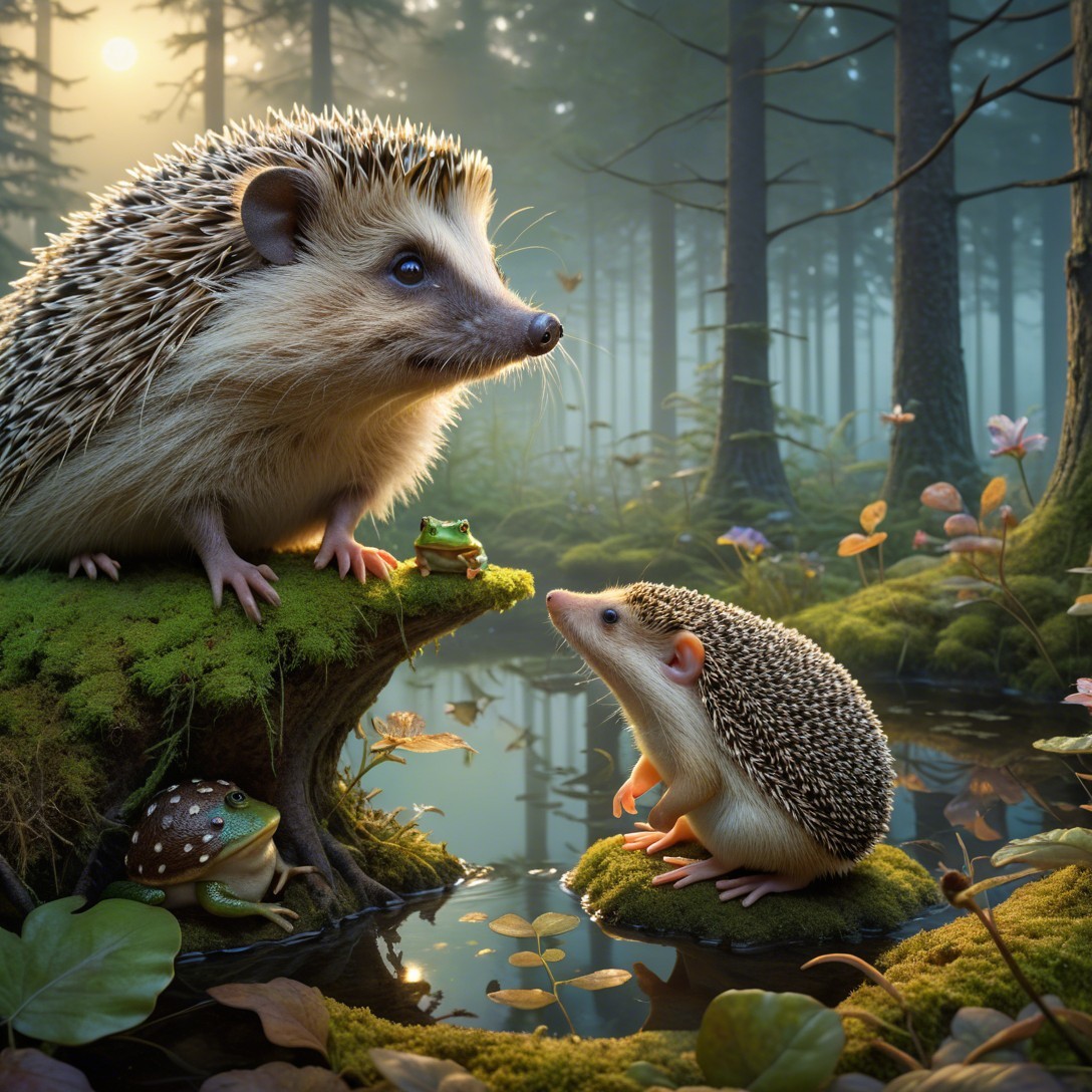 Two hedgehogs and two frogs in a magical moonlit forest surrounded by light mist, moss, and mushrooms. The larger hedgehog is on the left, looking to its right at a smaller hedgehog on the right, which is also looking at the bigger hedgehog. Both hedgehogs and one of the