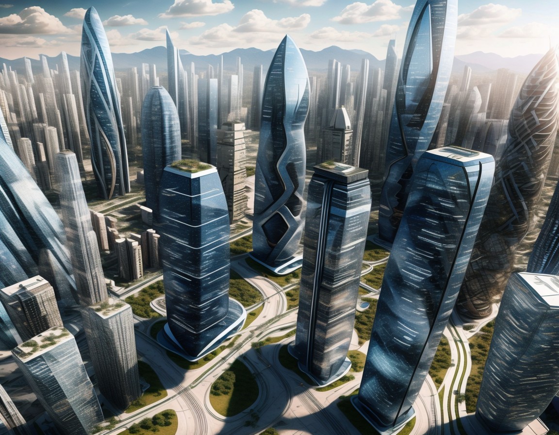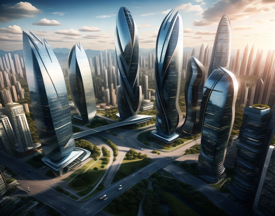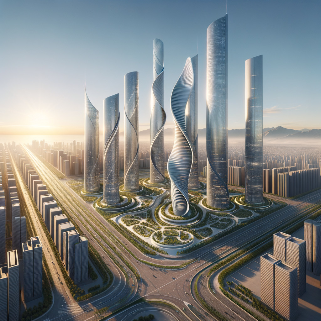Futuristic skyscrapers with spiraling designs amidst a cityscape at sunrise, showcasing modern architecture and urban planning.