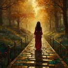 Serene forest scene with woman in red dress