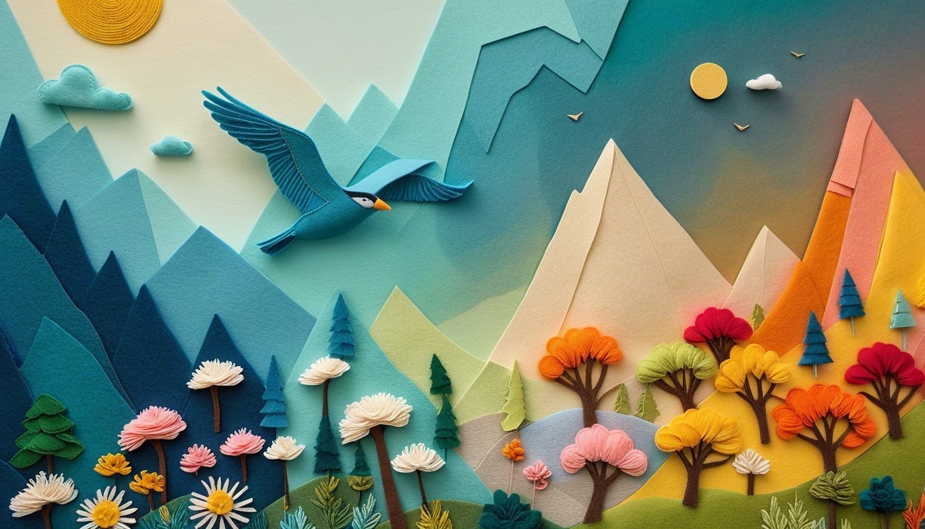 A vibrant landscape made of layered felt, featuring colorful mountains, green hills, and stylized trees with bright foliage. The scene includes clouds and a sun, creating a whimsical atmosphere.