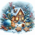 A cozy, snow-covered cottage adorned with festive lights and ornaments, surrounded by evergreen trees and a bright, winter sun. Snowflakes gently fall, adding to the holiday charm.