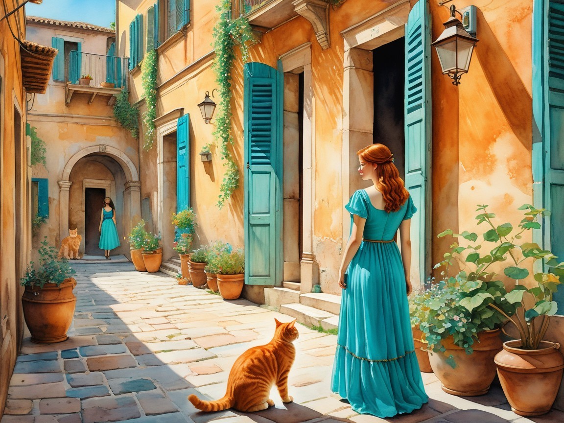 In a sunlit, colorful street, two women in elegant turquoise dresses stand amidst vibrant potted plants and charming architecture, with a curious orange cat nearby, adding to the enchanting scene.