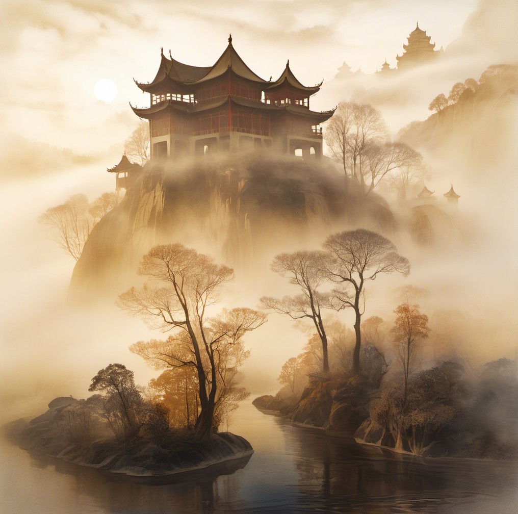 A serene bonsai tree with twisting branches and vibrant foliage sits in a tranquil setting, surrounded by misty mountains and a traditional pagoda, evoking peace and harmony.