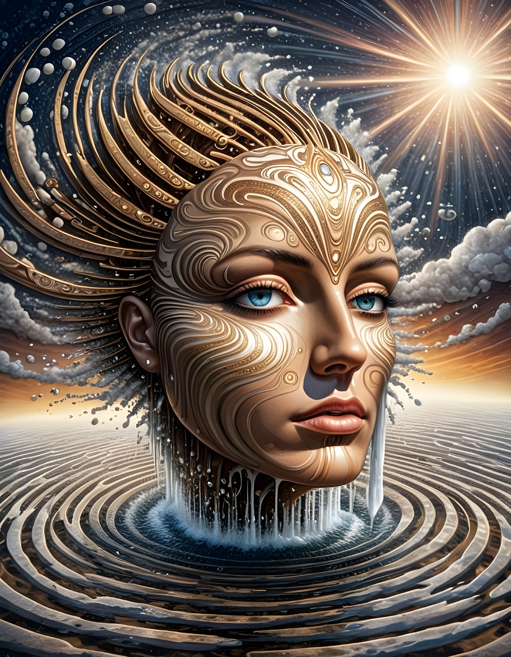 A mesmerizing, surreal portrait features a woman’s face intricately adorned with swirling patterns. Water cascades around her, set against a stunning sky filled with dynamic clouds and sunlight.