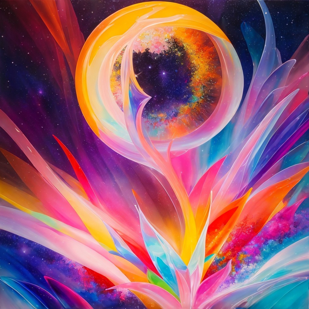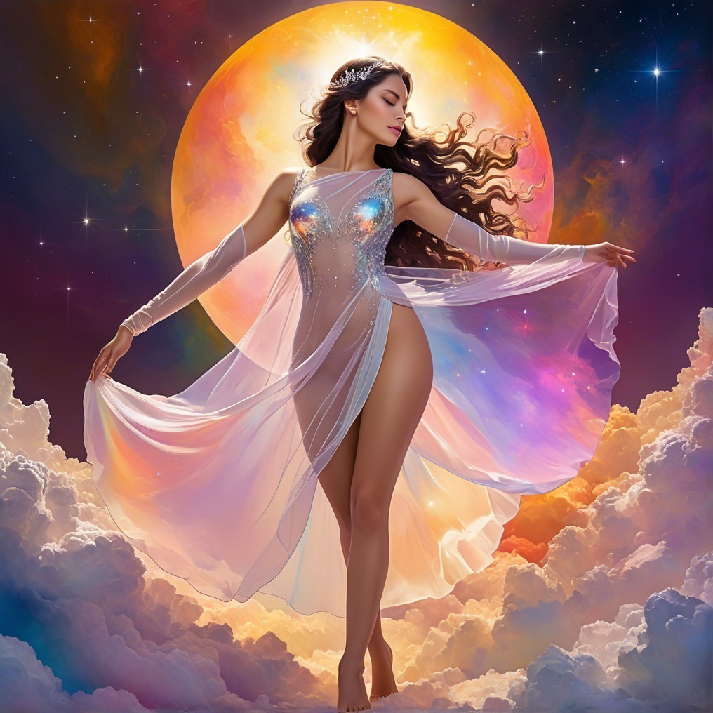 A striking figure in a silver dress strides confidently through vibrant flames, with her flowing hair and a glowing sun-like element behind her, embodying power and transformation amidst a fiery backdrop.