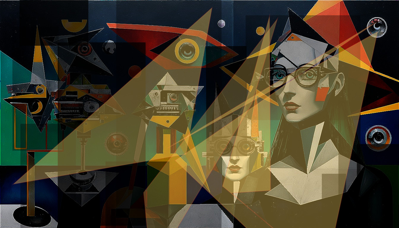 The artwork features two stylized women with striking glasses, set against a cosmic background with geometric shapes and celestial objects, blending surrealism and retro aesthetics.