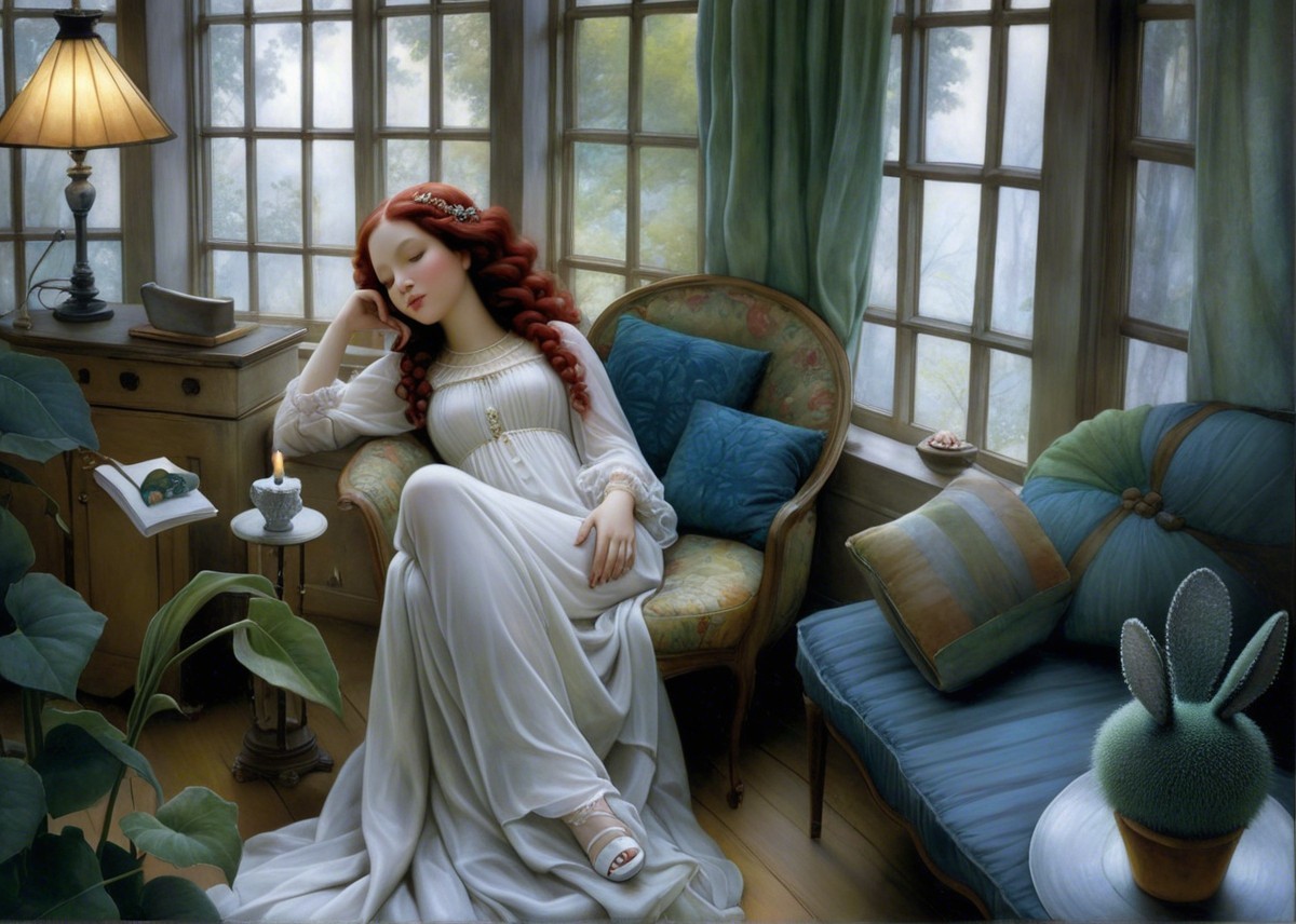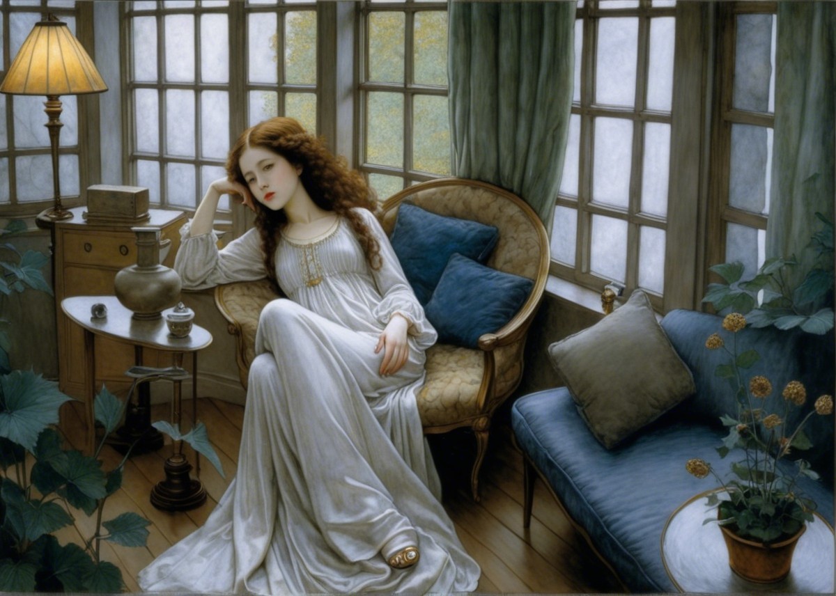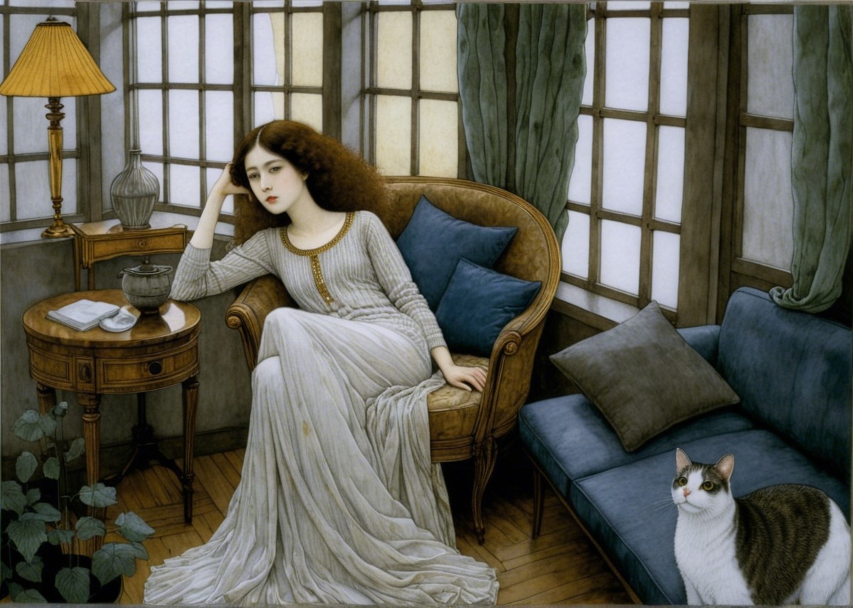 A melancholic woman in a flowing gray dress sits thoughtfully in a cozy room. Two cats linger nearby, and soft light filters through the window, illuminating her pensive expression.