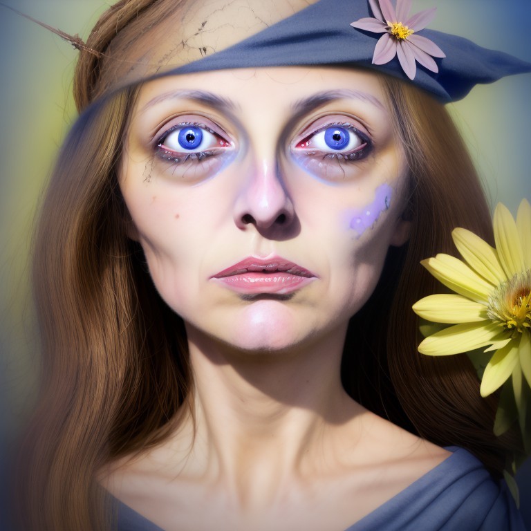 A woman with vibrant blue eyes, flower adornments in her hair, and a yellow headband gazes intensely.