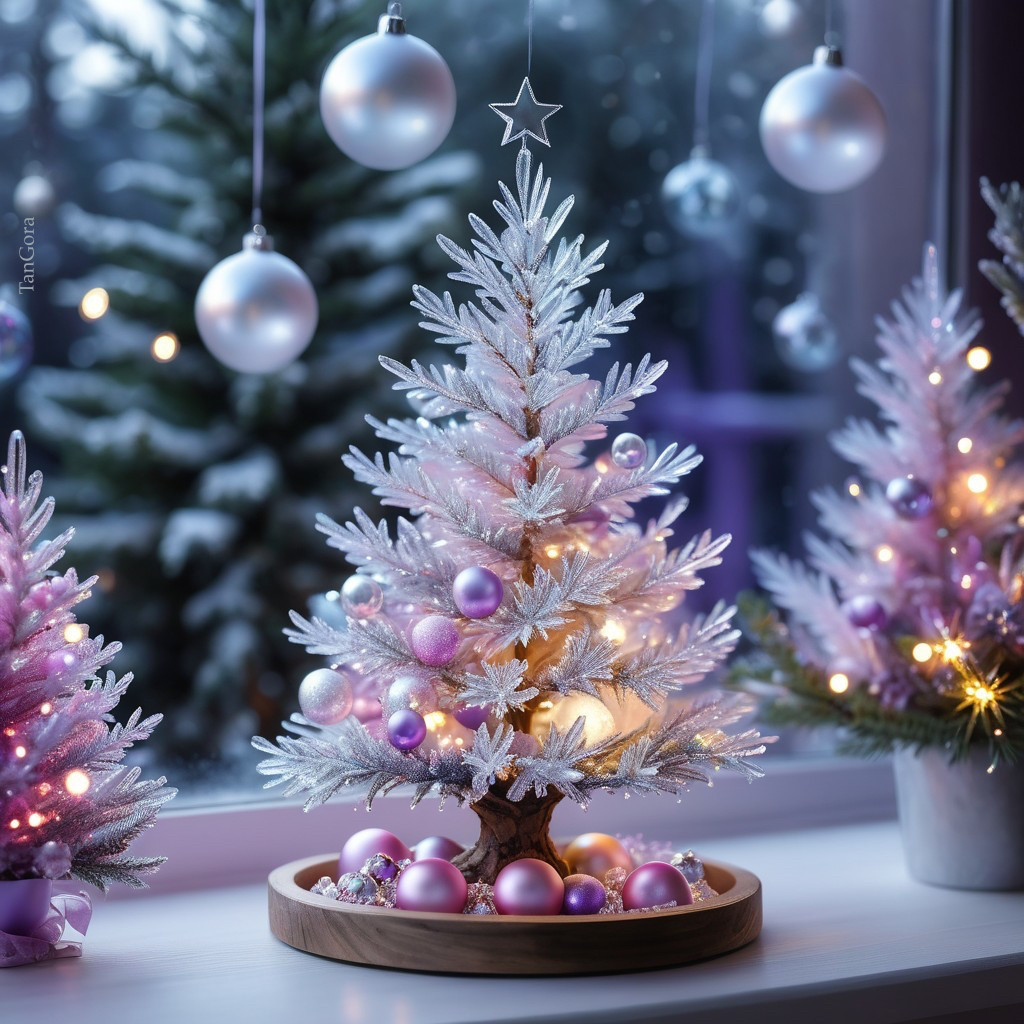 A beautifully decorated mini Christmas tree with white branches, adorned with pink and purple ornaments, glimmers beside larger trees, all against a snowy window backdrop.