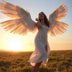 A woman in a flowing, elegant gray gown stands on a grassy hill, with large, majestic angel wings spread behind her, illuminated by a warm, golden sunset. She exudes grace and serenity.