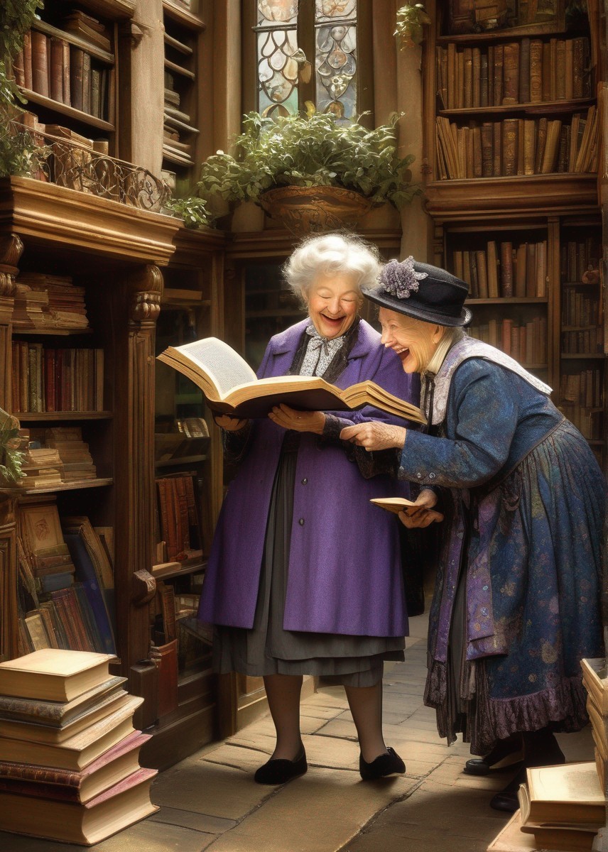 Two elderly women in vintage clothing laugh joyfully while sharing a book in a cozy, book-lined room.