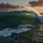 A crashing wave catches the golden light of sunset, creating a vibrant display of green and blue hues. Fluffy clouds float above, while a bird glides gracefully in the distance.