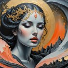 A vibrant, abstract painting of a cat with striking green eyes, set against a swirling cosmic background of blues, oranges, and intricate patterns, creating a whimsical, enchanting atmosphere.