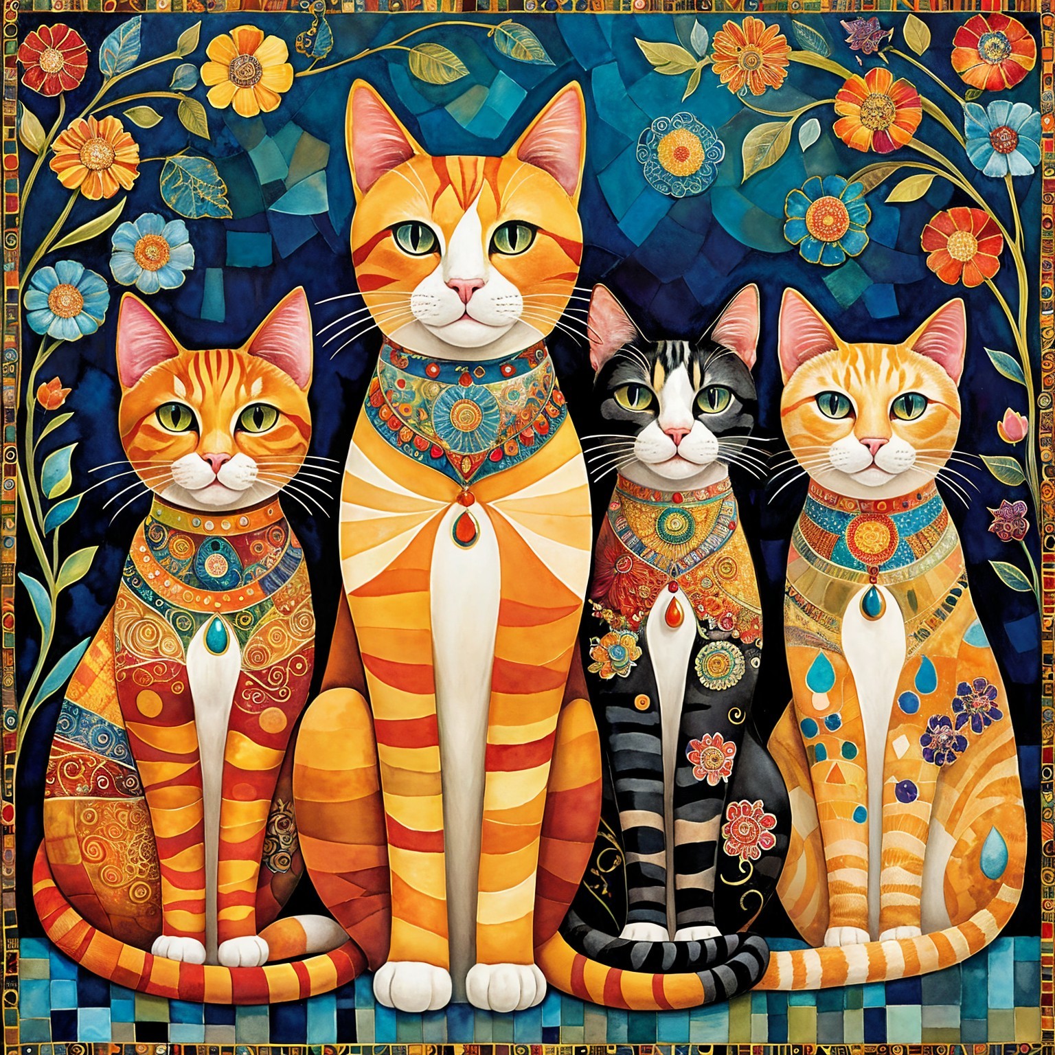 Prompt: "Create whimsical cat art featuring three full-body cats, each adorned with intricate and colorful patchwork patterns. While inspired by Gustav Klimt's designs, ensure the focus remains on the cats themselves, allowing their playful personalities to shine through. The cats should be depicted in a vibrant, dreamy setting with soft, dynamic lighting that enhances their details. Each cat should be distinct, showcasing a variety of patterns and colors that evoke a sense of fantasy and imagination. The background can feature subtle elements that complement the whimsical nature of the cats without overshadowing them. The overall look should balance the intricate details of the cats with a playful and charming aesthetic, reminiscent of folk art while still embracing a unique and imaginative style.