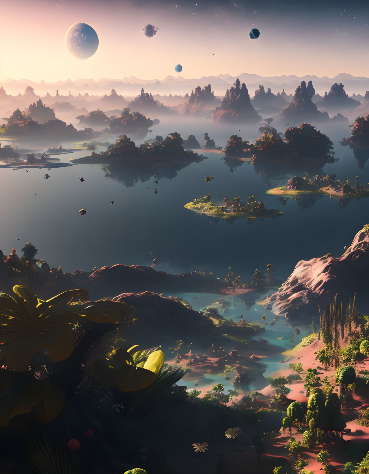 Tropical landscape with vibrant foliage, thatched huts, misty hills, and birds in sunrise