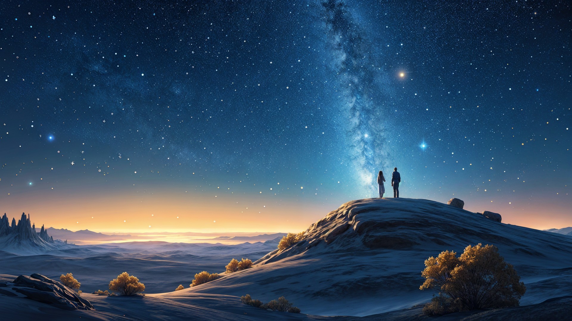 A couple stands on a snowy hill, gazing at a stunning starry sky filled with the Milky Way. The serene landscape is bathed in soft twilight hues, creating a peaceful, enchanting atmosphere.