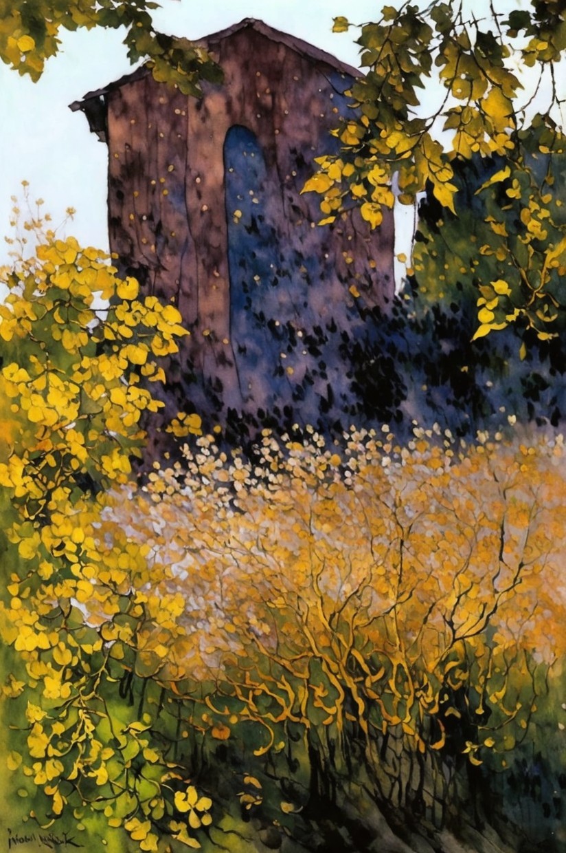 A watercolor painting of a person standing amidst vibrant yellow flowers and tall, dark vegetation, with subtle hints of a building in the background. From my own image.